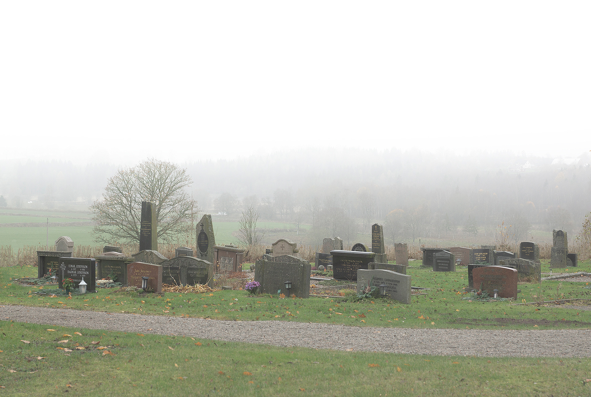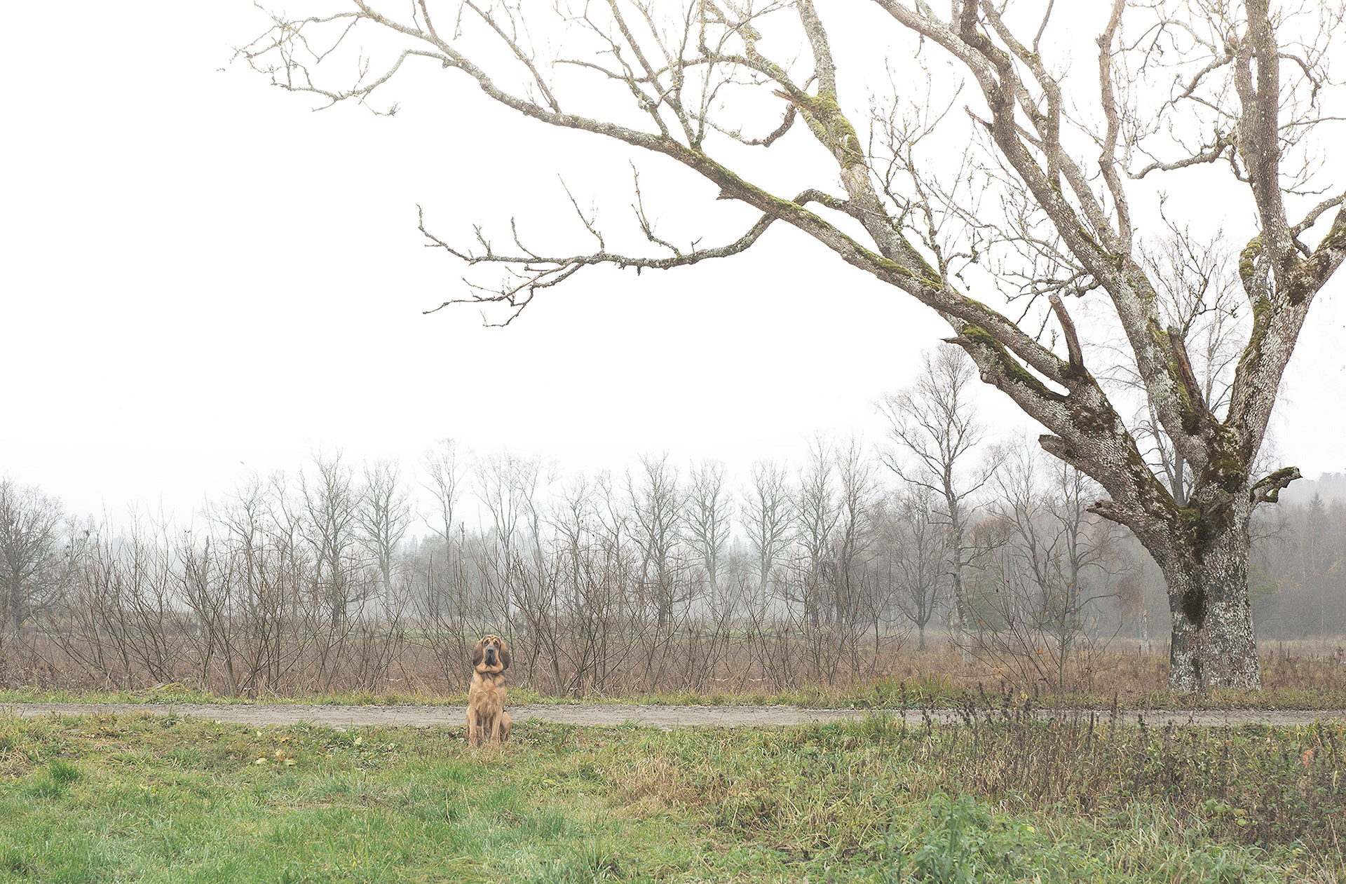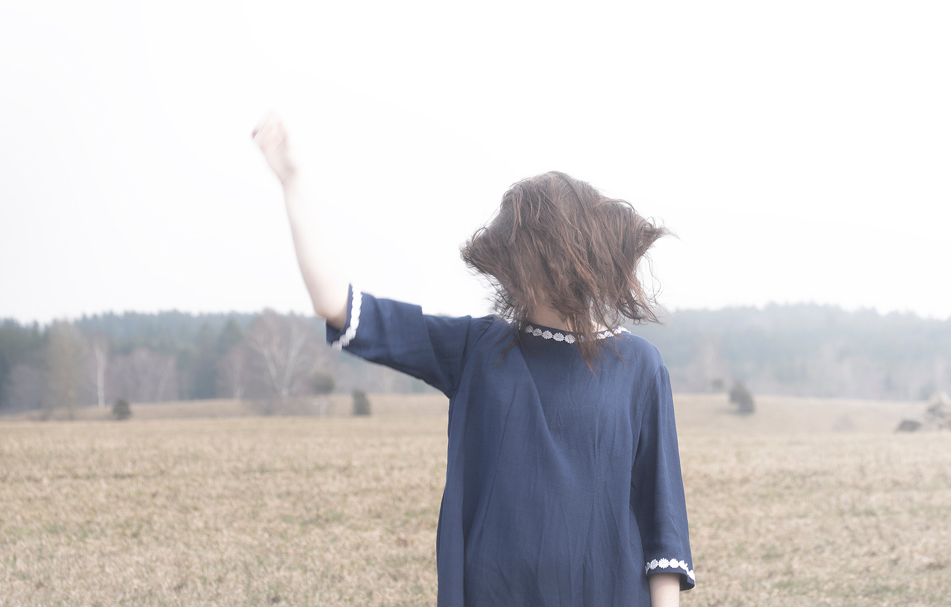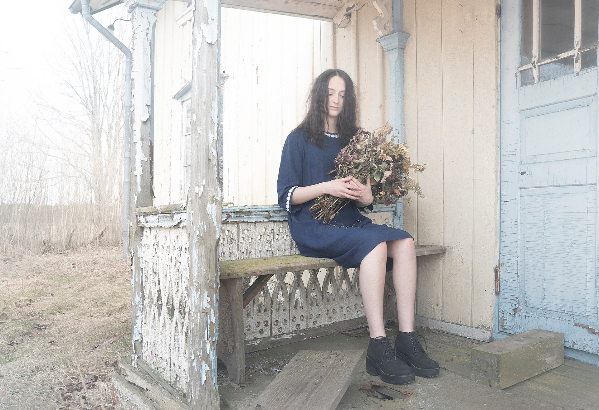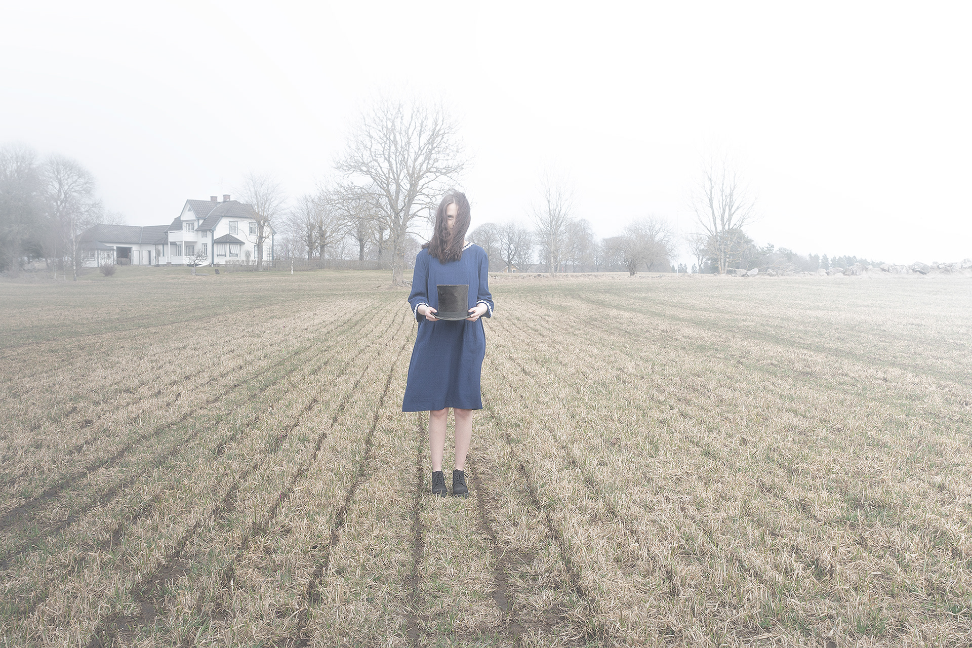A mix with landscape photos, macro and portraits set in a foggy, soft and grey landscape.
