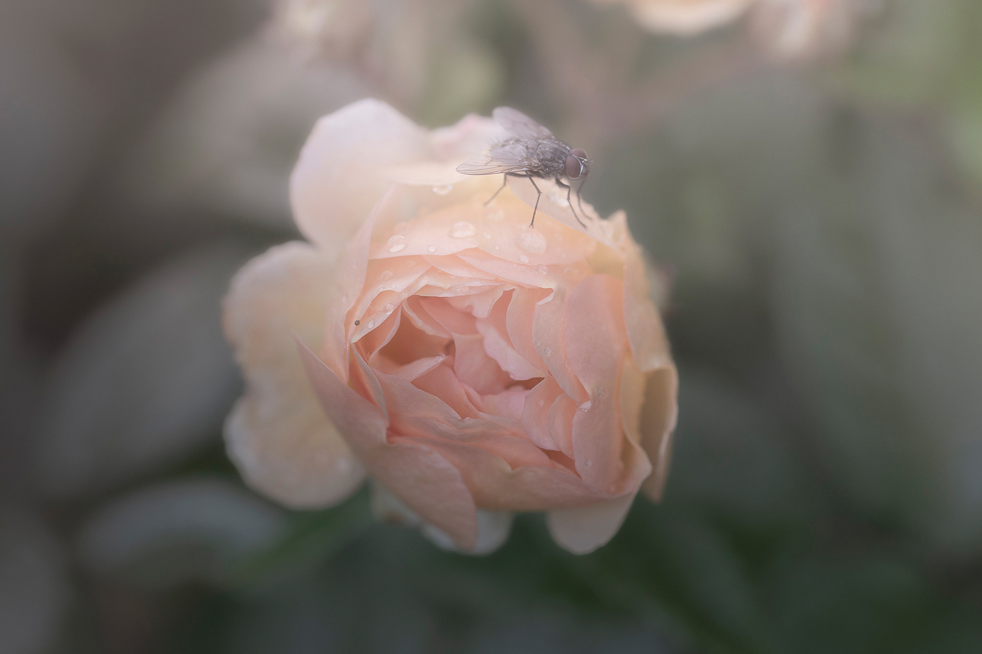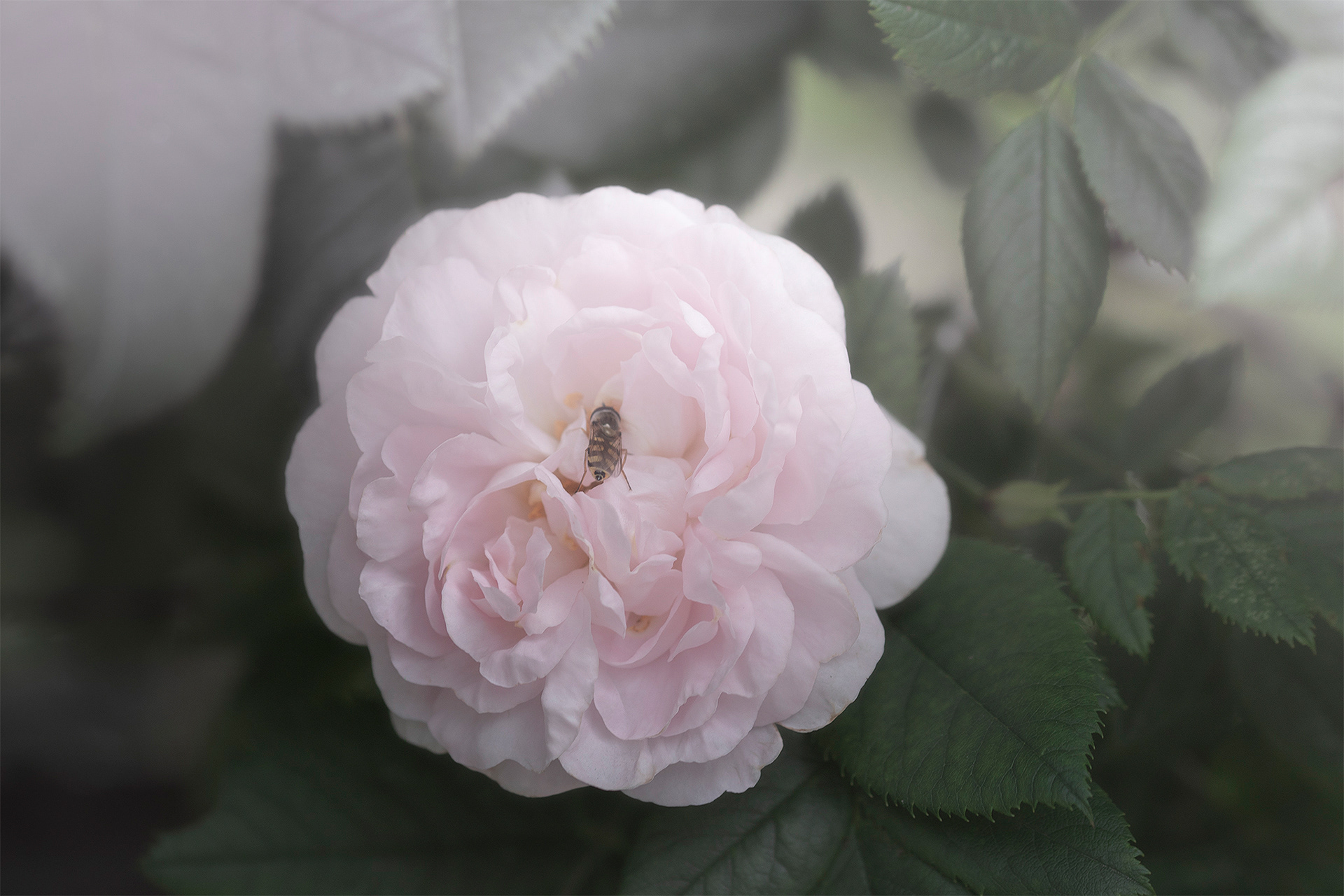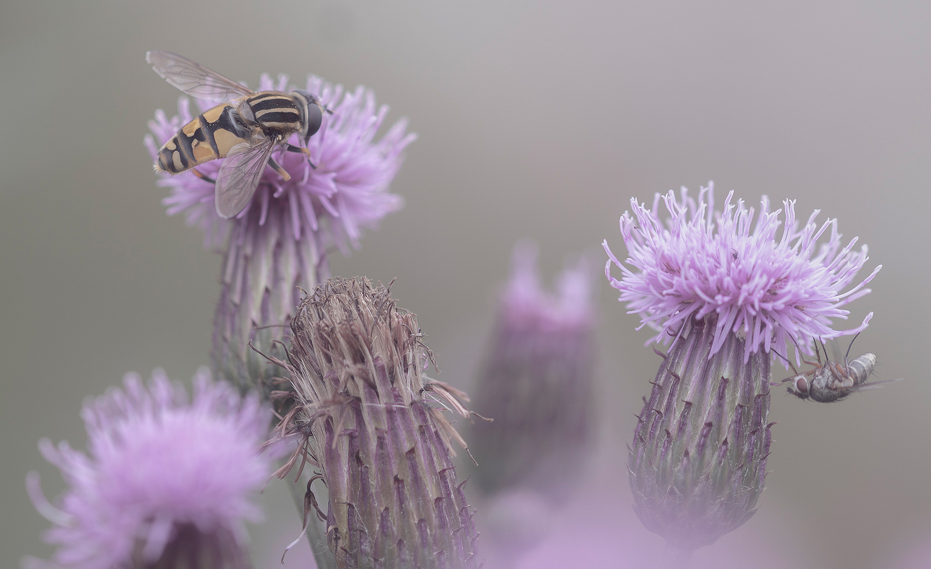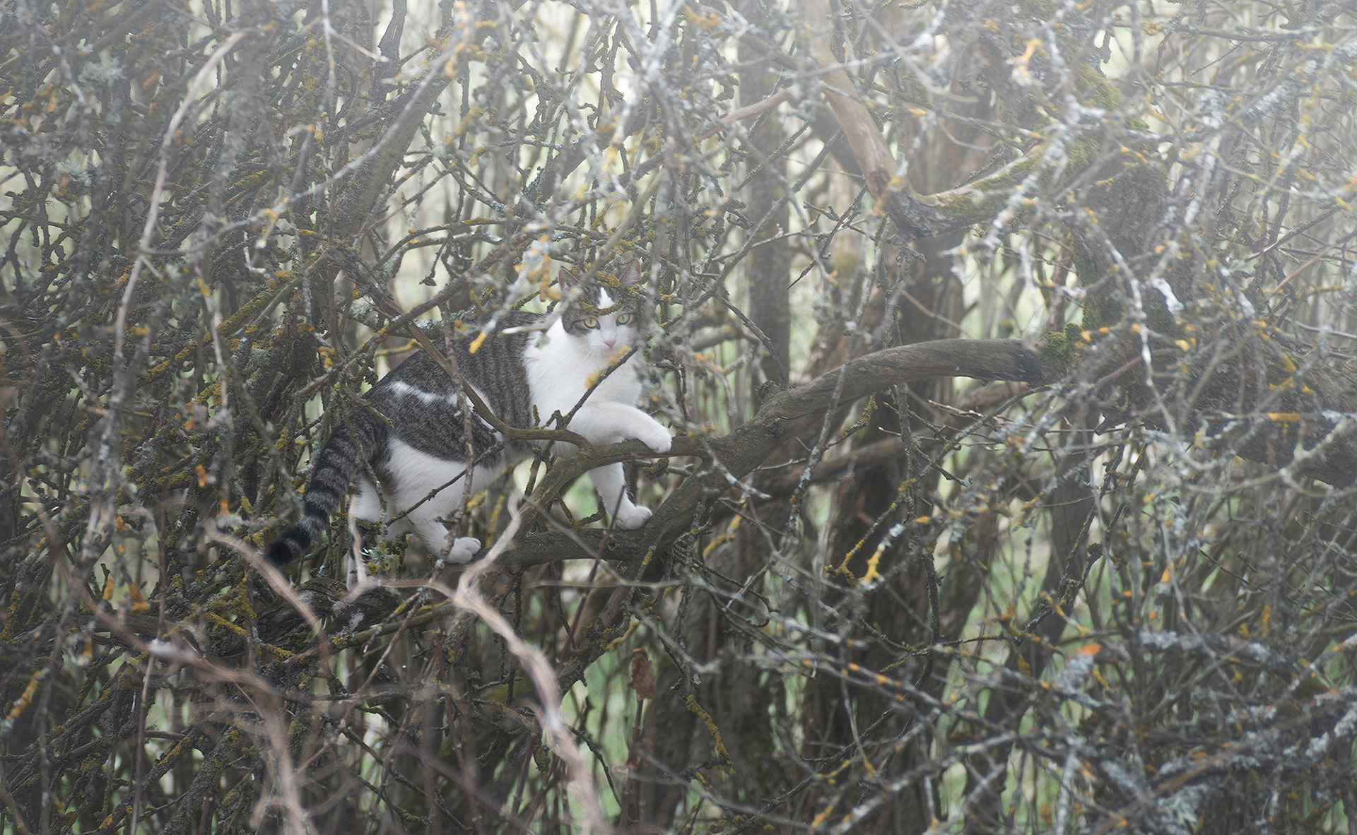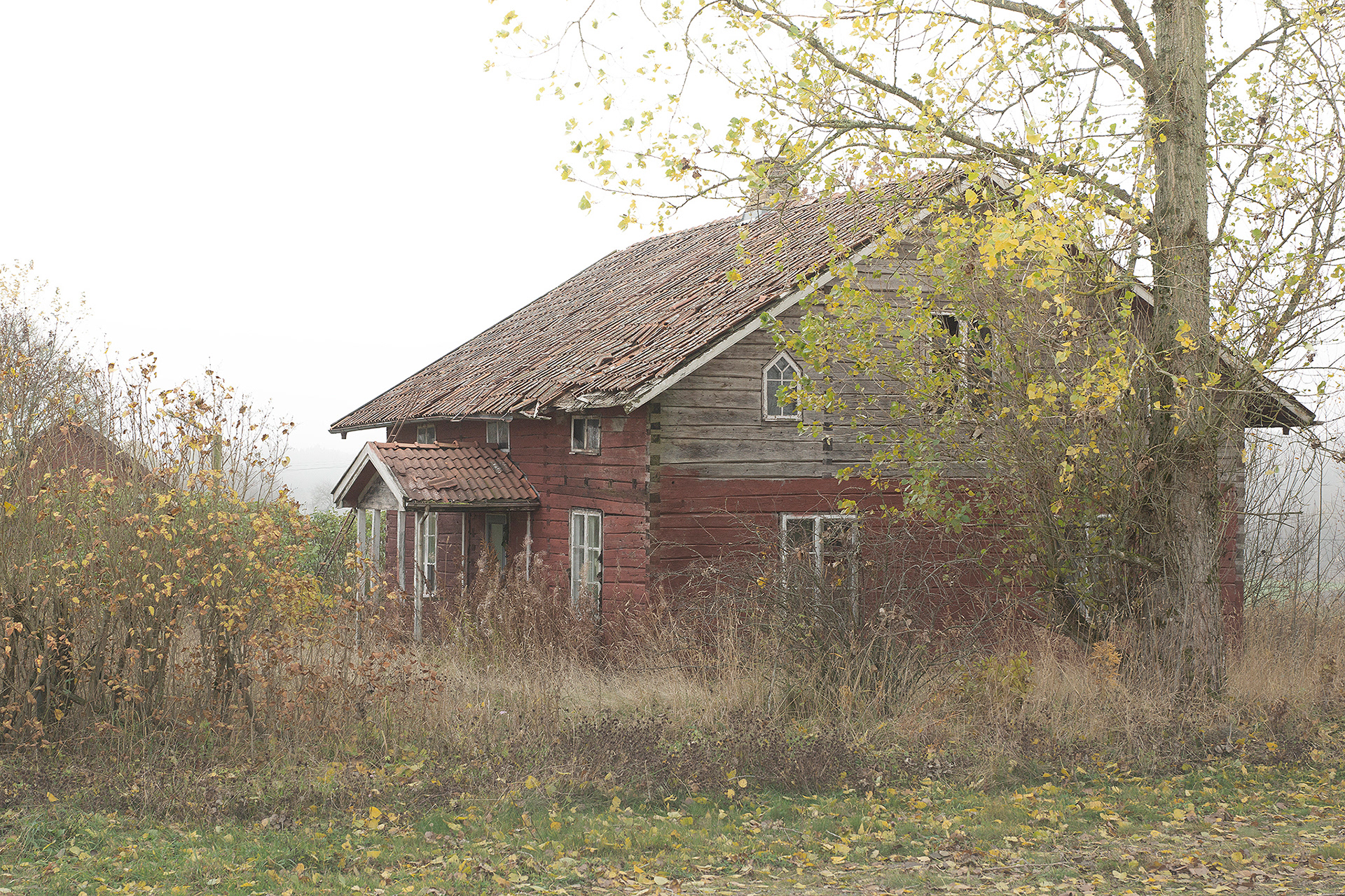 A mix with landscape photos, macro and portraits set in a foggy, soft and grey landscape.